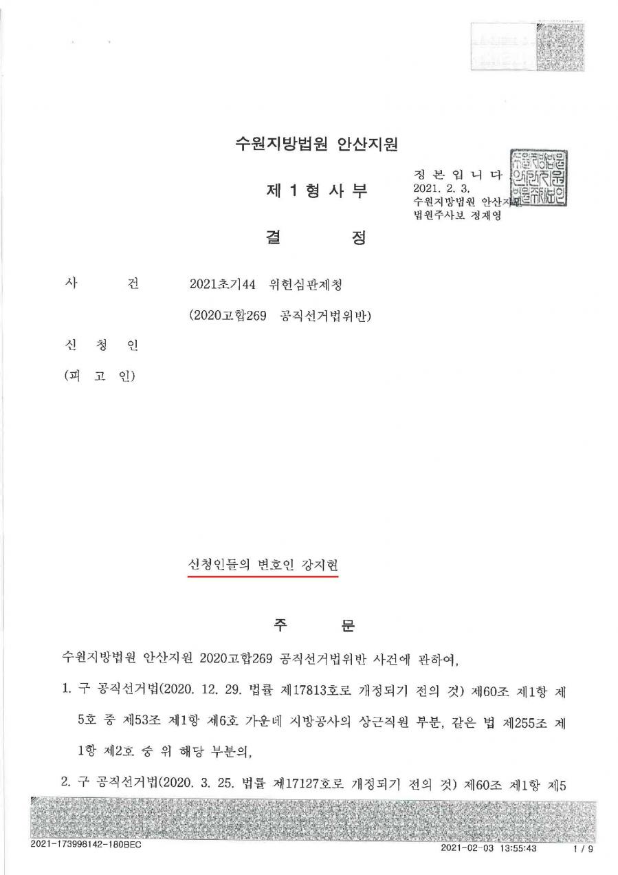 - 사건 : 수원지방법원 안산지원 2021초기44 위헌심판제청